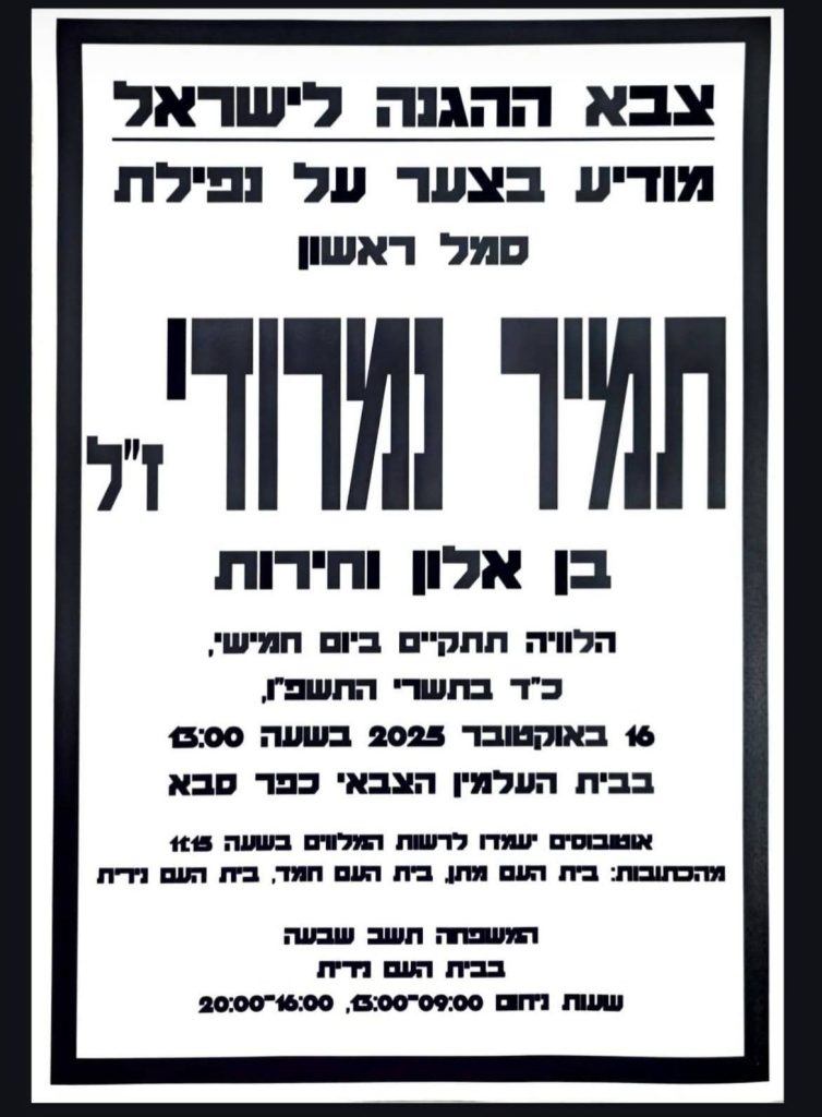 מחר (יום חמישי, 16/10) יובא למנוחות בשעה 13:00 בבית העלמין הצבאי בכפר סבא, סמ"ר תמיר נמרודי – שנחטף מבסיסו באוגדת עזה בשבעה באוקטובר ונרצח בשבי.