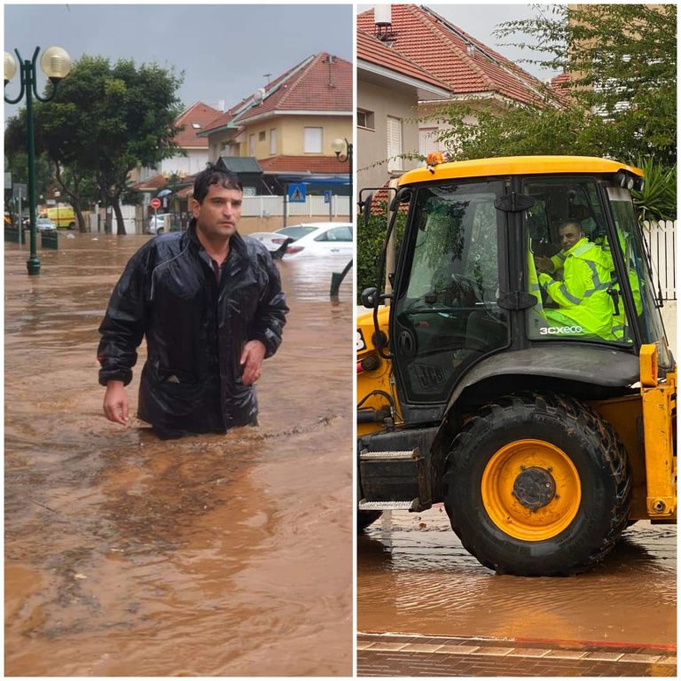 בתמונה משמאל ראש עיריית הוד השרון אמיר כוכבי, כאשר חצי גוף טבוע באגם, מימין ראש עיריית כפר סבא, רפי סער שהגיע עם משלחת סיוע לעזור בפינוי תושבים מהאגמים שנוצרו בשיטפונות העזים.